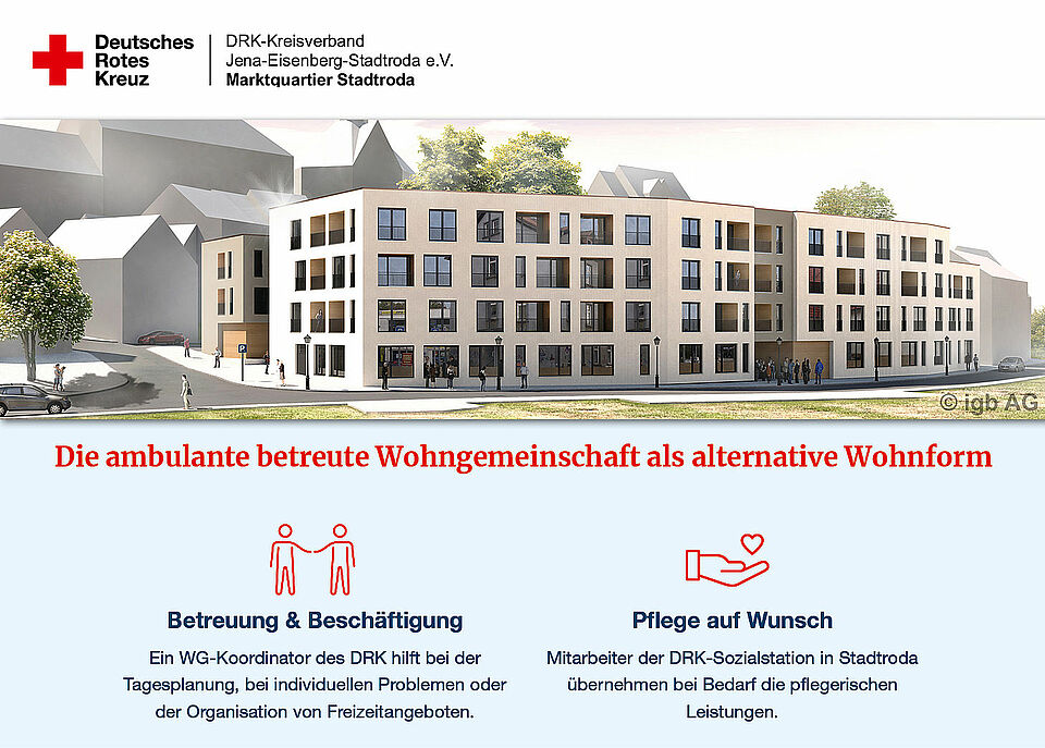 Neben der Wohngemeinschaft bietet das DRK-Marktquartier Stadtroda weitere Seniorendienste wie ambulante Pflege, Tagespflege und Essen auf Rädern an. Diese Angebote können je nach Bedarf zusätzlich in Anspruch genommen werden.